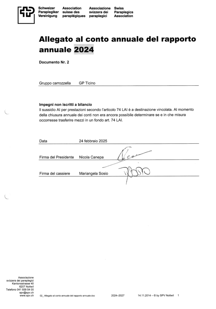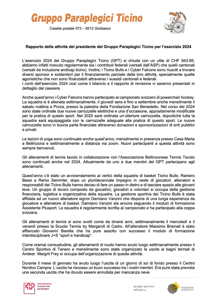 Questa sezione raccoglie i documenti annuali più rilevanti relativi al Gruppo Papaplegici Ticino. La sezione sarà aggiornata annualmente per fornire all’utente le versioni più recenti disponibili.